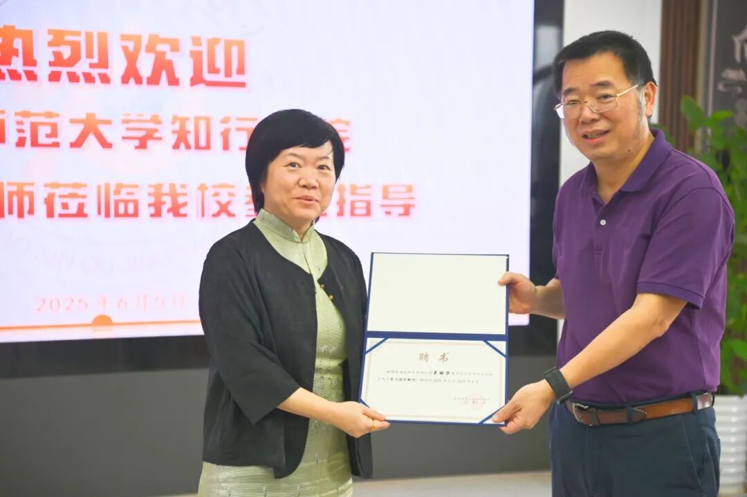 在每一所学校的交流座谈过程中,知行书院执行院长黄伟教授都代表书院向实习学校指导教师颁发了荣誉聘书,对指导学生的辛勤付出予以感谢。实习学校则向圆满完成实习任务的书院学子颁发了实习证明。此外,知行书院教工党支部与礼和中学支委签署了党建共建协议,双方未来在人才培养、社会服务、课题研究等方面开展进一步合作。