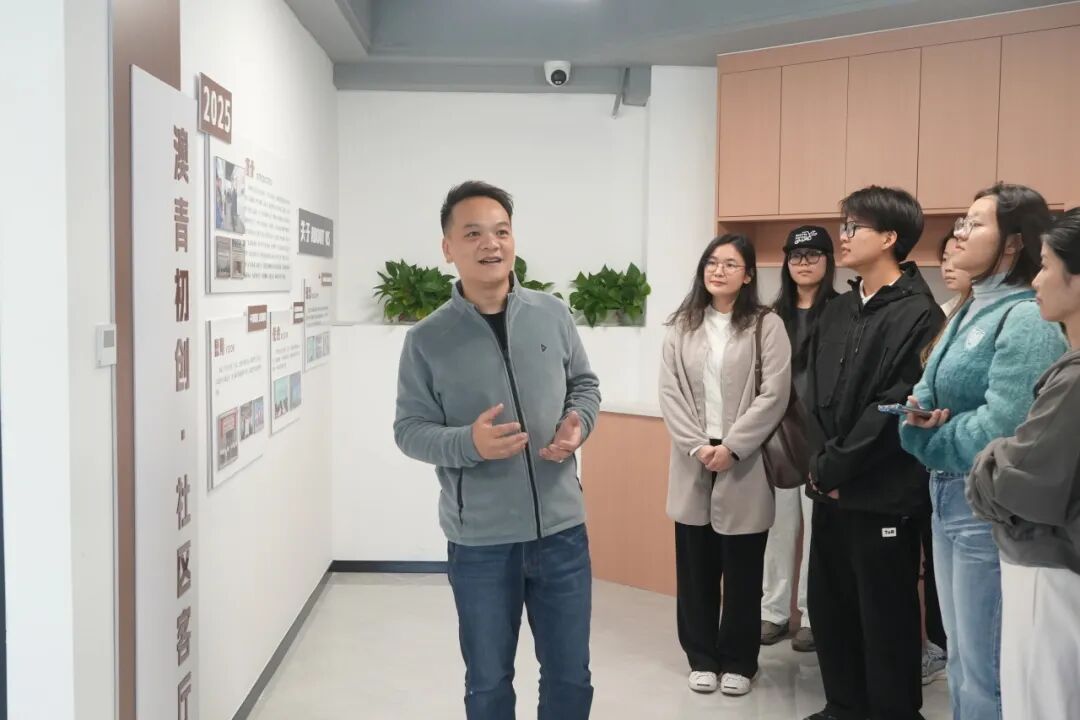 首先,访学团参观了澳青初创・社区客厅。这里空间配套完善、布局合理,周边交通便捷、生活设施齐全,充分考虑了青年创业者的办公与发展需求。这种“办公+生活”的一体化配套模式,让师生们切实感受到横琴为澳门青年创业打造的友好环境,也理解了“30分钟湾区生活圈”为跨境创业带来的便利。