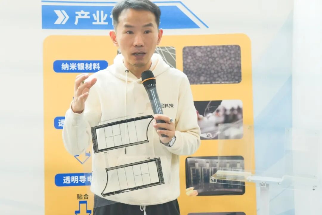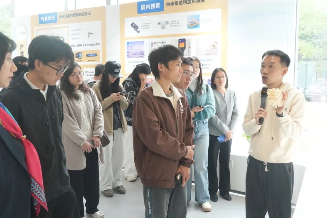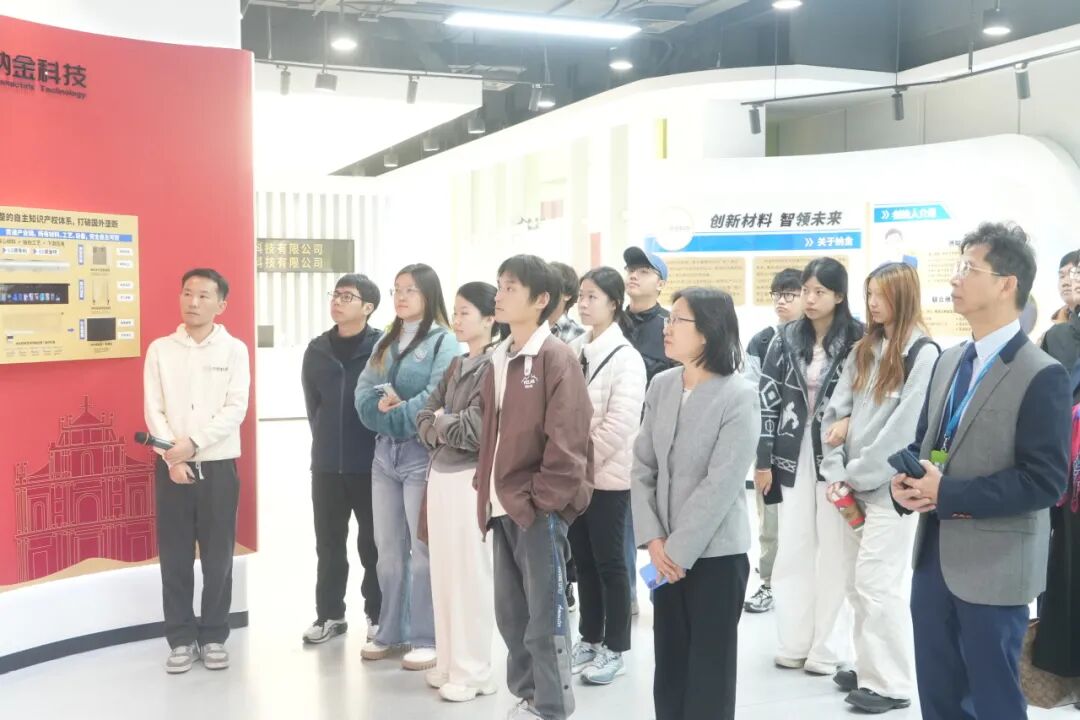 访学团一行首先来到纳金科技,开启硬科技探索之旅。作为澳门青年创业代表企业,纳金科技在纳米材料领域深耕多年,构建了从上游材料合成到下游模组器件的完整产业路线。现场,工作人员详细介绍了核心产品纳米银透明导电膜——其以储量充足、工艺简便、延展性强的优势,成功替代传统稀缺材料氧化铟锡,广泛应用于智能家电、车载设备等领域,原材料利用率接近100%,生产效率大幅提升。