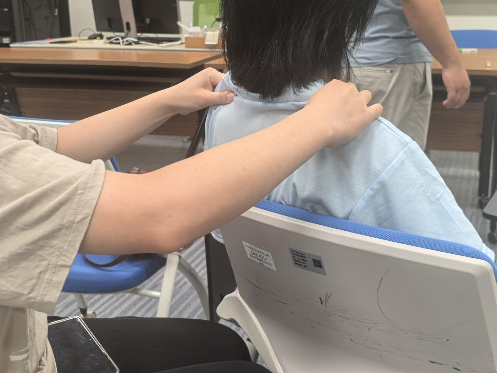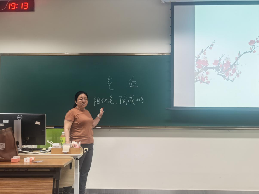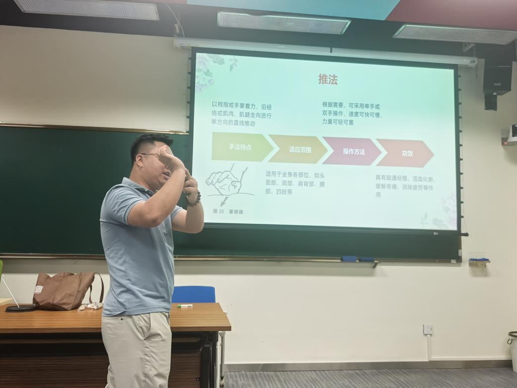 余老师为同学们介绍了推拿六大基本手法,详细讲解了每个手法的特点、适应范围、操作方法和功效。同学们分组互相推拿,两位老师一对一进行指导纠正。随后,余老师介绍了导引养生术,让同学们对导引的理论基础、内容及分类、基本原则有了基础的了解。最后,两位老师针对本次课前收集的困扰同学们的健康小问题进行了详细解答。