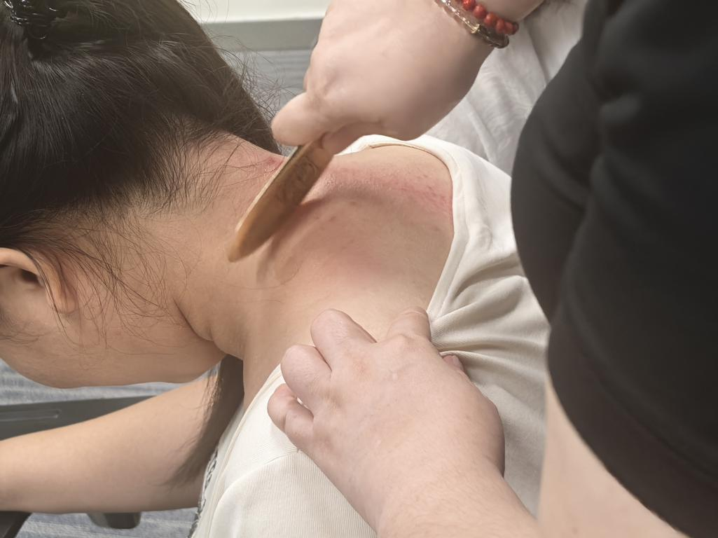 砭术是一种古老的中医外治法,它运用石制工具在人体表皮进行按摩、刮痧、温熨等操作,以达到疏通经络、调和气血、平衡阴阳的目的。刘老师为同学们讲解了刮痧原理、刮痧现象、适应症、刮痧功效、常用的刮痧用具、刮痧介质以及操作注意事项等一系列专业知识。随后进行刮痧示范,让同学们对“有病就出痧,无病不出痧,病重痧就重,病轻痧就轻”有了更切实的理解。