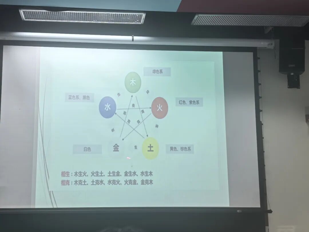 随后,刘老师为同学们讲解了中医的整体观念和辨证论治。本次课程最重点的部分为阴阳五行,又被称之为中医的灵魂。同学们踊跃发言讨论自己注意到的生活中的阴阳,课堂上一片欢声笑语。刘老师通过形象的描述,帮助我们记忆五行的相生:树木需要水的滋养,而木头又能用来生火,火烧完后留下灰烬即为土,金子埋藏在土里,金子在一定高温下会变为金水,故木生火、火生土、土生金、金生水、水生木。