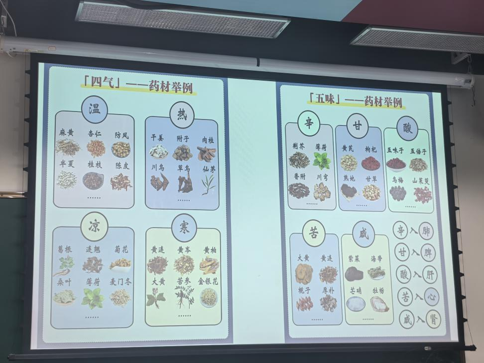 同学们重点学习了中药的“四气五味”:酸入肝,苦入心,甘入脾,辛入肺,咸入肾;还观察了中药的“升降沉浮”,花类一般上升,矿物类、根茎类一般下降。基于药食同源,根据地域和气候,刘老师建议大家平时可以煮祛湿四神汤喝,健脾祛湿。最后,同学们通过鼻子去闻、用手去触碰中药样本,真切地感受到了不同中药材的味道和形状。