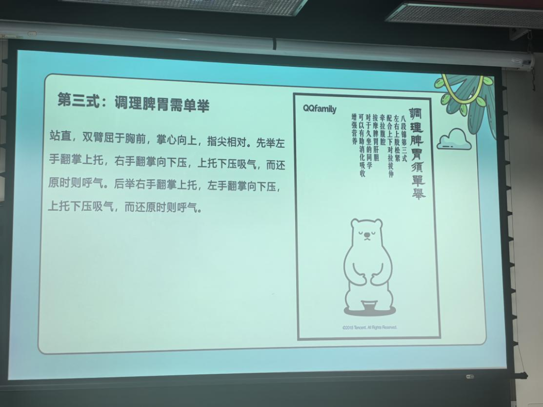 通过选读《黄帝内经》上古天真论,同学们深入理解中医学防病保健的主导思想、女子和男子生长发育与生殖规律。通过素问篇,刘老师提醒我们夏季应保养“长气”,在夜晚睡眠,早早起身。最后,余老师为同学们讲解了六字诀,并带大家进行了锻炼,同学们都表示劳累了一天的身体得到了放松。