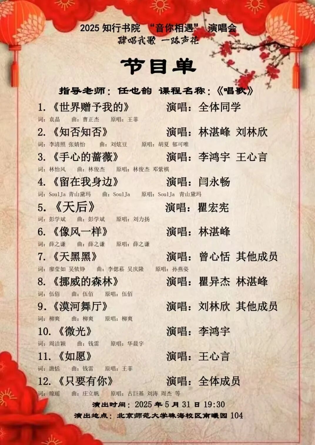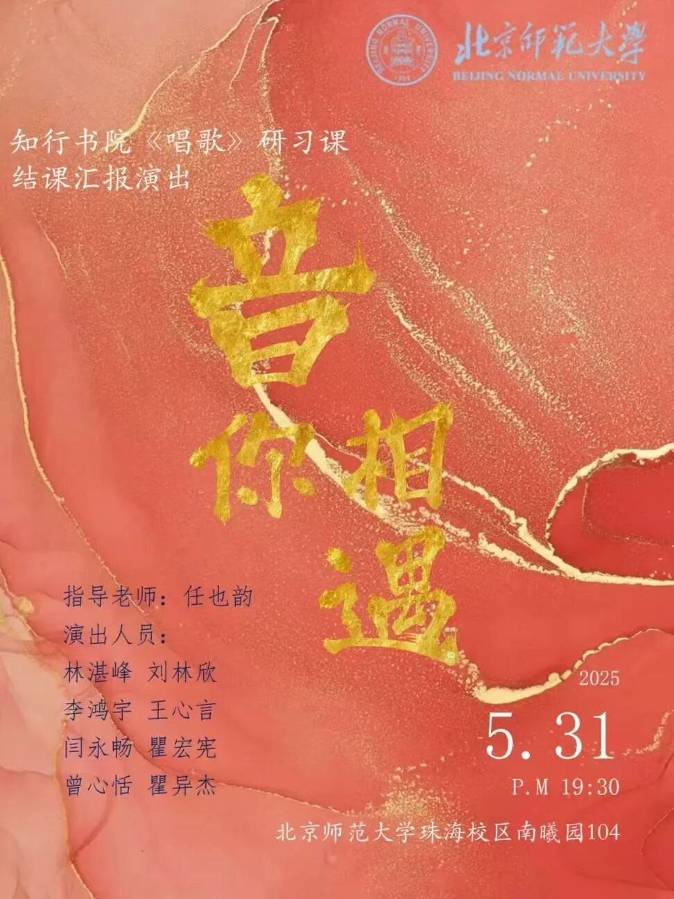 2025年5月31日晚,南曦园205教室,随着“光·响”音乐会的终章音符落下,本学期《唱歌》(第2期)研习课正式画上圆满句号。本次课程由北京师范大学艺术与传媒学院副教授任也韵老师倾情授课,她带领同学们从零基础出发,解锁歌唱的奥秘,在旋律中遇见更自信的自己。